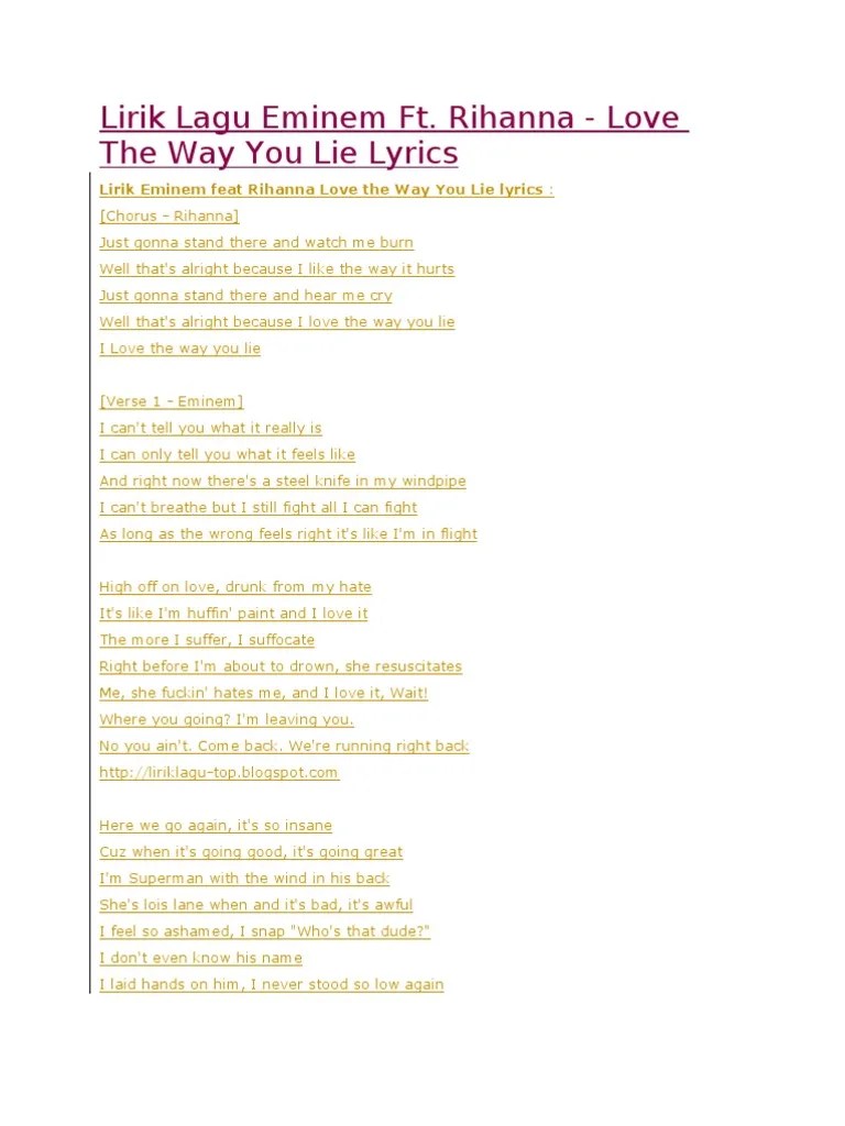 Just gonna stand there and hear me cry well that's alright, because i love the way you lie i love the way you . Rihanna love the way you lie(solo) lyrics are property and copyright of it's owners. Lagu 'love the way you lie' dari rihanna dengan eminem dirilis pada 6 agustus 2010, liriknya ditulis oleh eminem dan grant alexander junior. Love the way you lie, eminem lyrics ft. Lyrics to song love the way you lie(solo) performed by rihanna. An interesting performance by lee hi and 2000won for the . Eminem love the way you lie: Just gonna stand there and watch me burn well, that's alright because i like the way it hurts just g. On the first page of our story the future seemed so bright then this thing turned out so evil don't know why . | smule social singing karaoke app. Listen to albums and songs from .